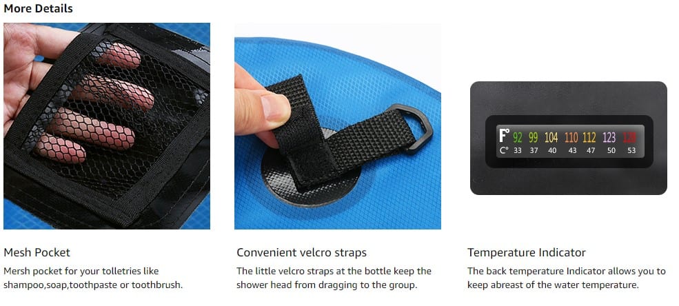 Solar Energy-saving Heating: This solar camping water bag is made of eco-friendly and leak-proof PVC material, non-toxic, healthy and safe for people. With UV heat-seal coating, it can heat water for about 3 hours under direct sunlight, no need for any plug-in device, environmental protection and energy saving; the temperature indicator (°C/°F) on the back of sun shower bag can help you monitor water temperature, so you don’t need to guess the water temperature in remote areas!