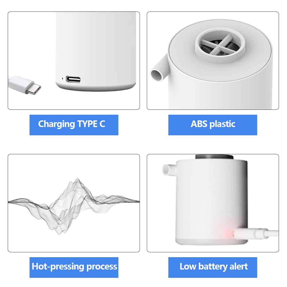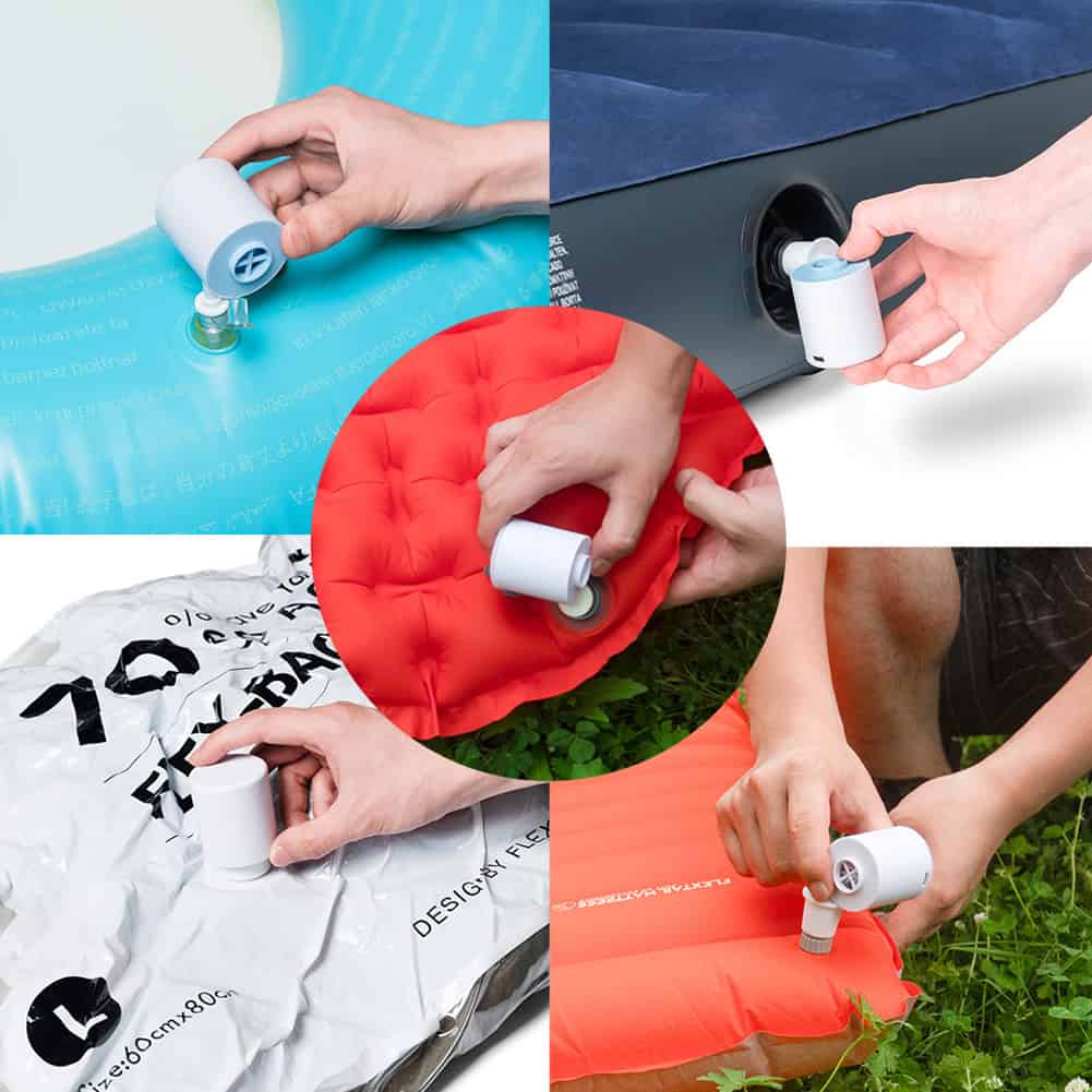 Blowing up your gear with your lungs causes humidity to build up inside your mattress and pillows every time you use them. Built-up humidity can cause mold or ice to form during colder temperatures, alongside other unpleasant smells. Quickly inflate anything with our 3-in-1 Mini electric inflatable pump! It is lightweight and mini compact, widely used for beach, camping, and outdoor parties. With TYPE-C charging port, our air pump is more versatile and has higher stability. The anti-splashing design can avoid the damage caused by splashing water and help you conquer the harsh outdoor environment. The air pressure value of 3500PA allows achieving rapid pumping, saving more than 50% of storage space. Save a lot of time and space for outdoor equipment and clothing storage! Buy now!