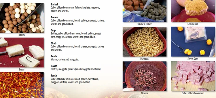 Bread, Sweet Corn, Groundbait, Worms, Caster, Boilies, Maggots, Fishmeal Pellets, Cubes of luncheon meat