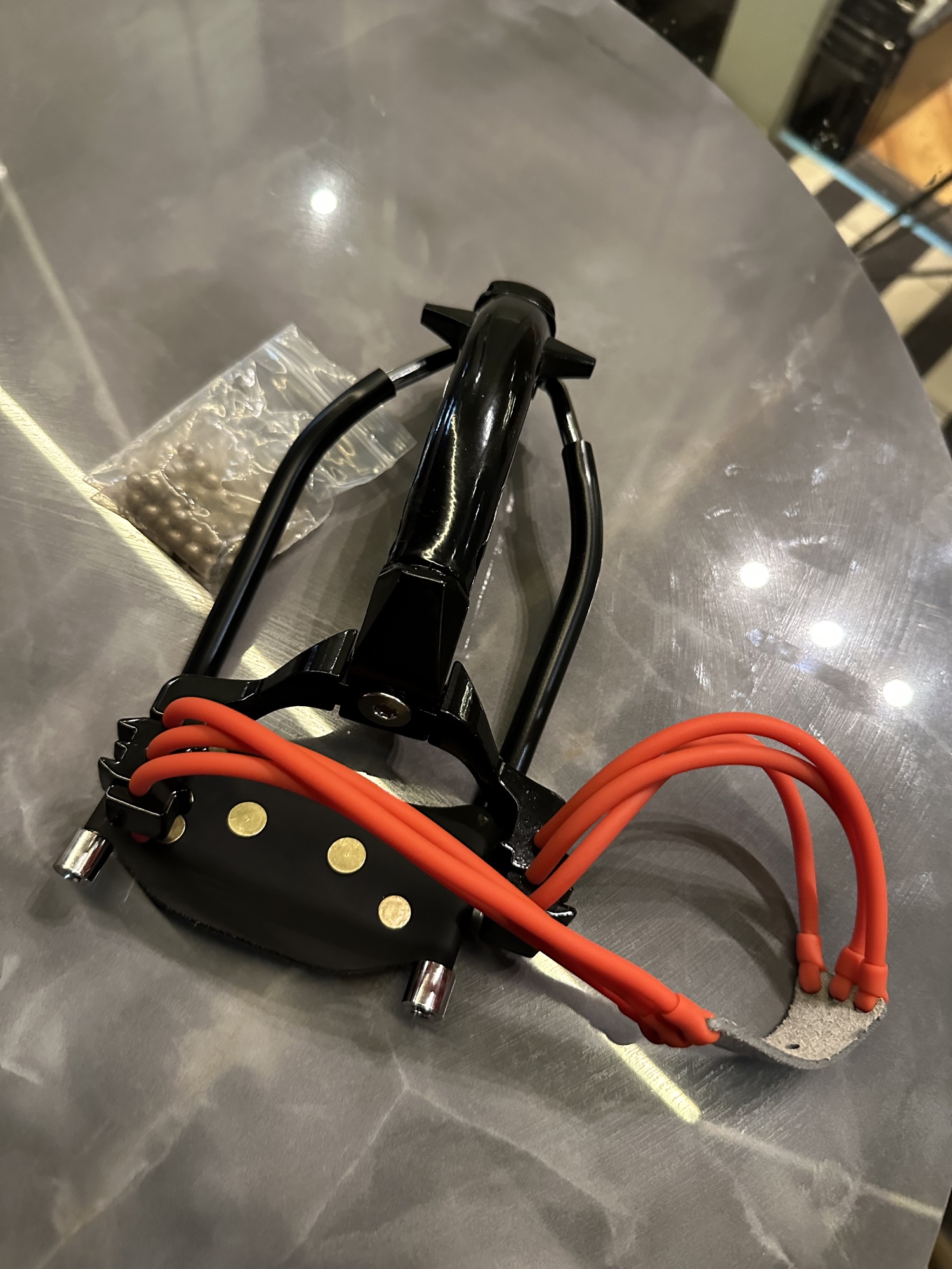 Super slingshot, all included; harnesses made of two and three rubber bands, targets, balls and hex corner wrenches. I am satisfied with the product. I recommend the store.