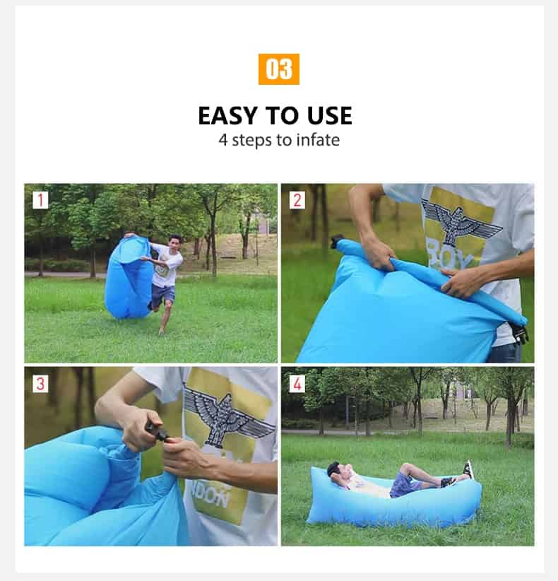 When you go camping, out for a BBQ, swimming at the beach, at the park, or any other outdoor activities this inflatable lounger must be your first choice of product! with its unique inflation process, the lounger collects air and can be filled up in seconds, no Pumps needed! super easy to inflate and deflate.
