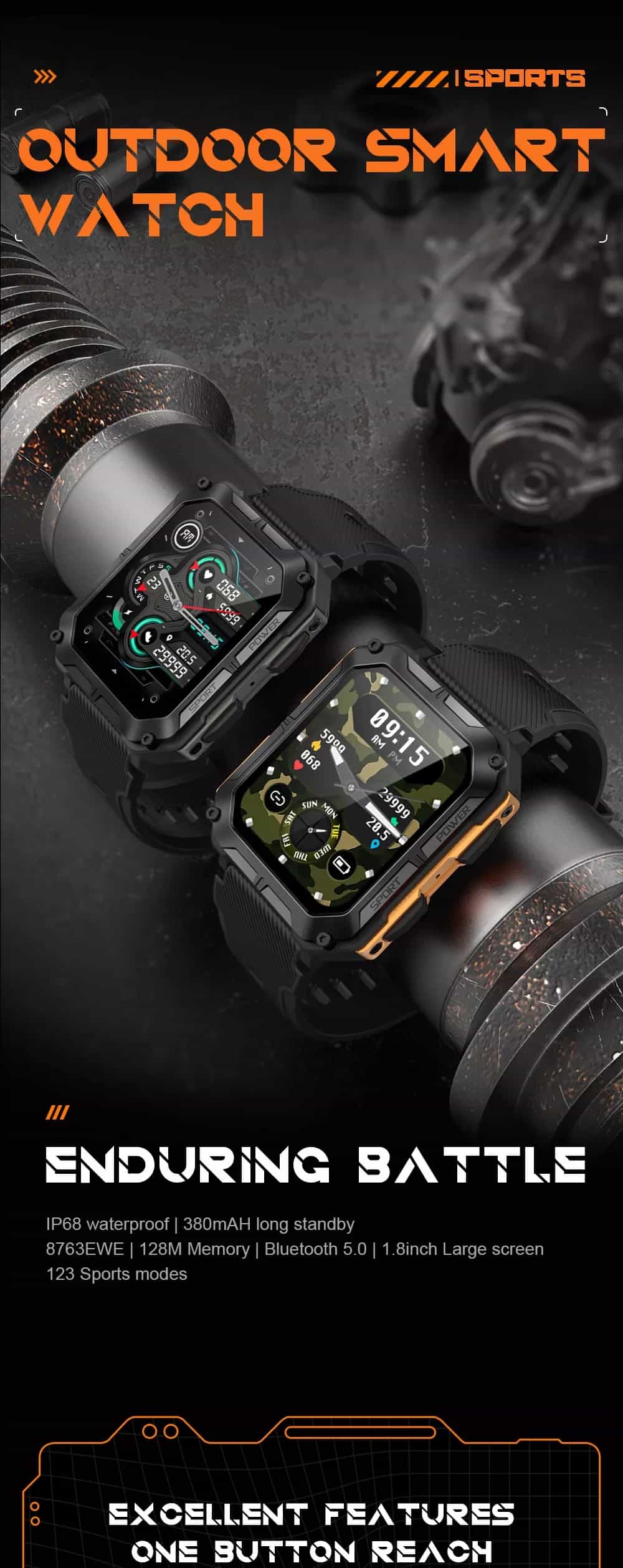 Overall, the wearable has a good waterproof rating, it has IP68 rating. It gives the wearable full water protection, splash proof, wash proof as well as with dust proof protection. If you are looking for a good looking outdoor smartwatch that is affordable, the Military Style Rugged Smartwatch might be a good pick.