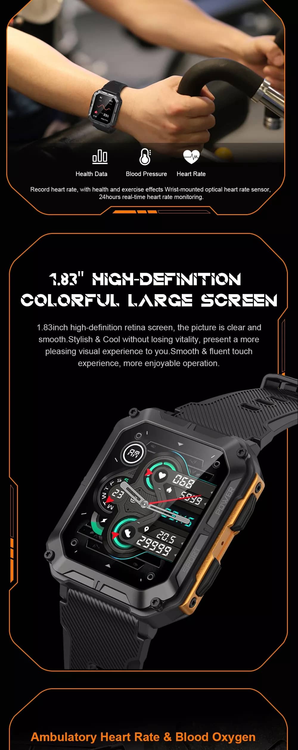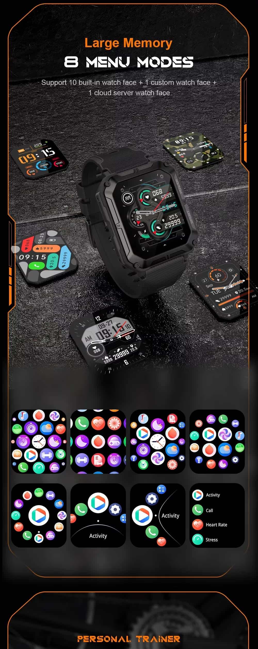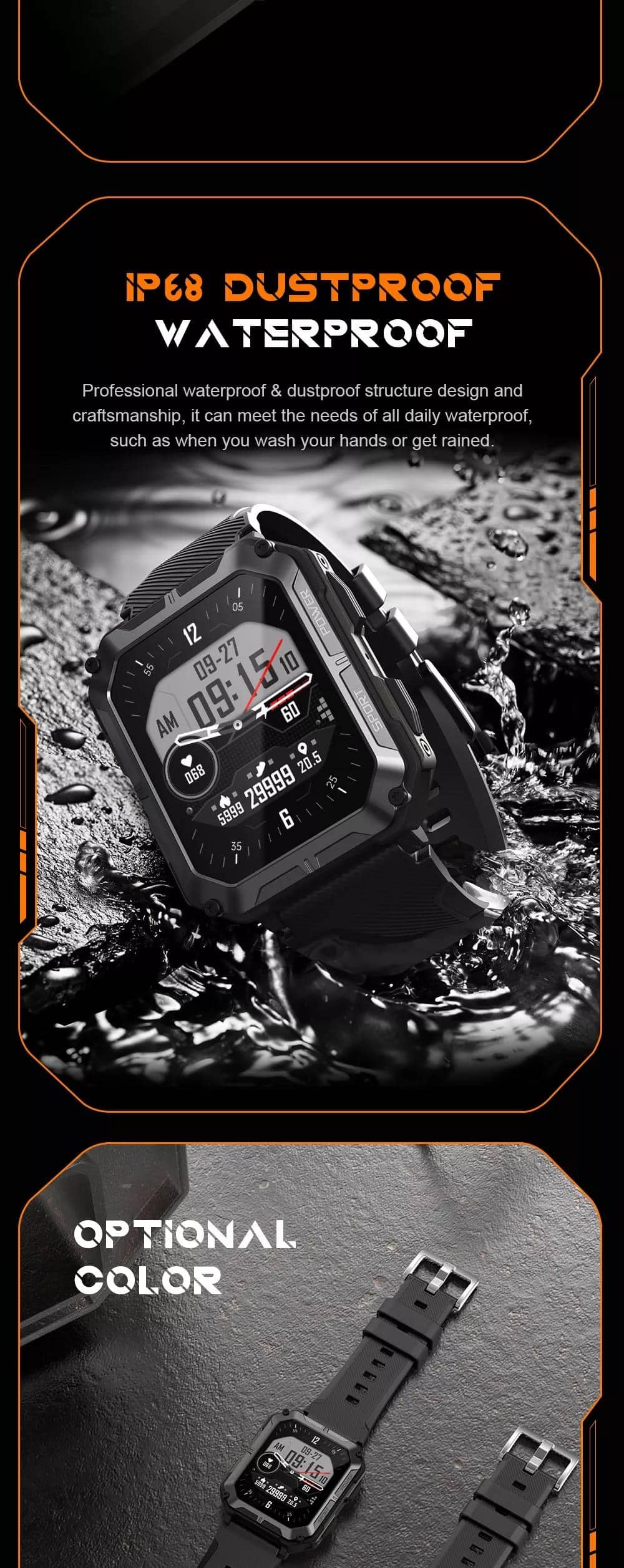 Its another military style, outdoor rugged smartwatch, the Military Style Rugged Smartwatch has that outdoor design, sporty. It has a mechanical look, layered frame with screws, octagonal size, PC material with combination of metal material. It has power buttons, power with dedicated sports button on its side. It is an attractive-looking rugged smartwatch, its not bulky like other rugged smartwatches in the market. The design of the Military Style Rugged Smartwatch is in the range of the popular Kospet Tank M1. The C20 Pro smartwatch has an outdoor look, and its frame is bump roof, that has an anti- smash body, anti-freeze body.