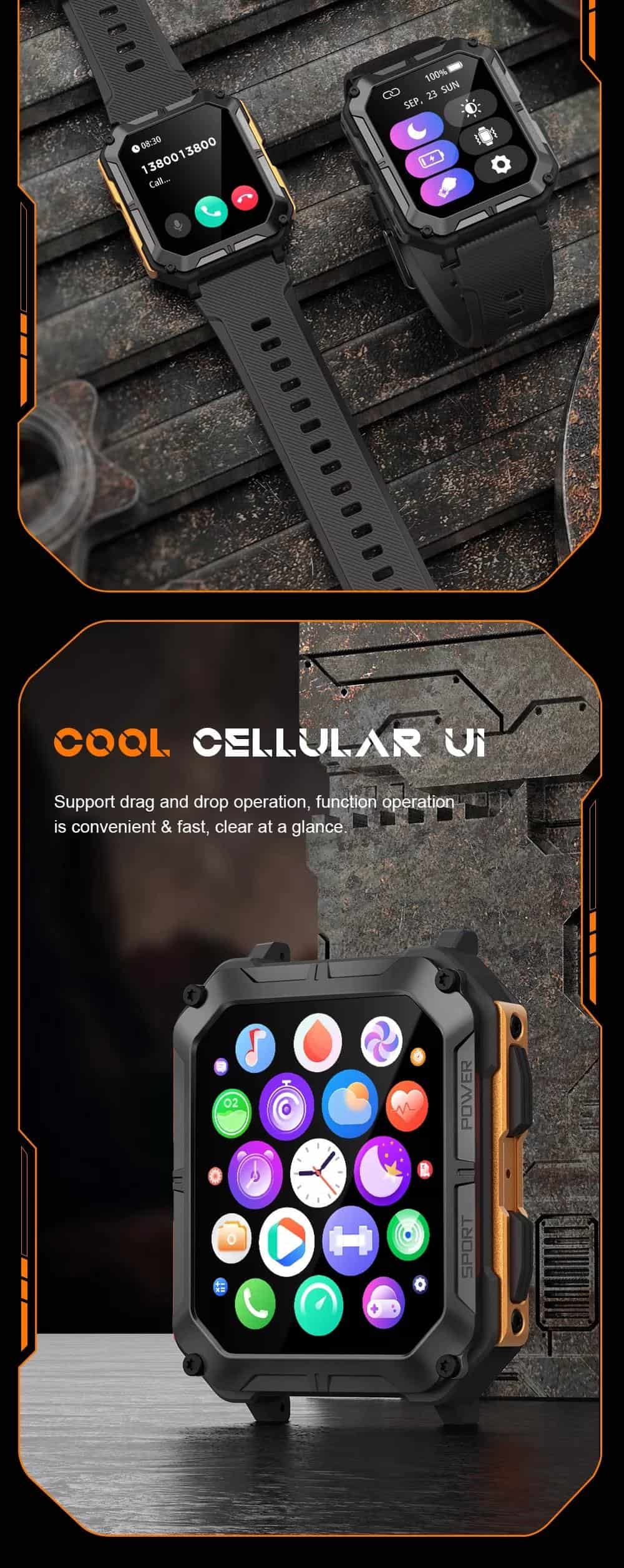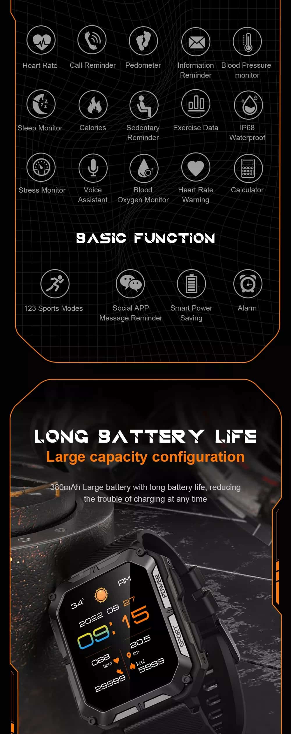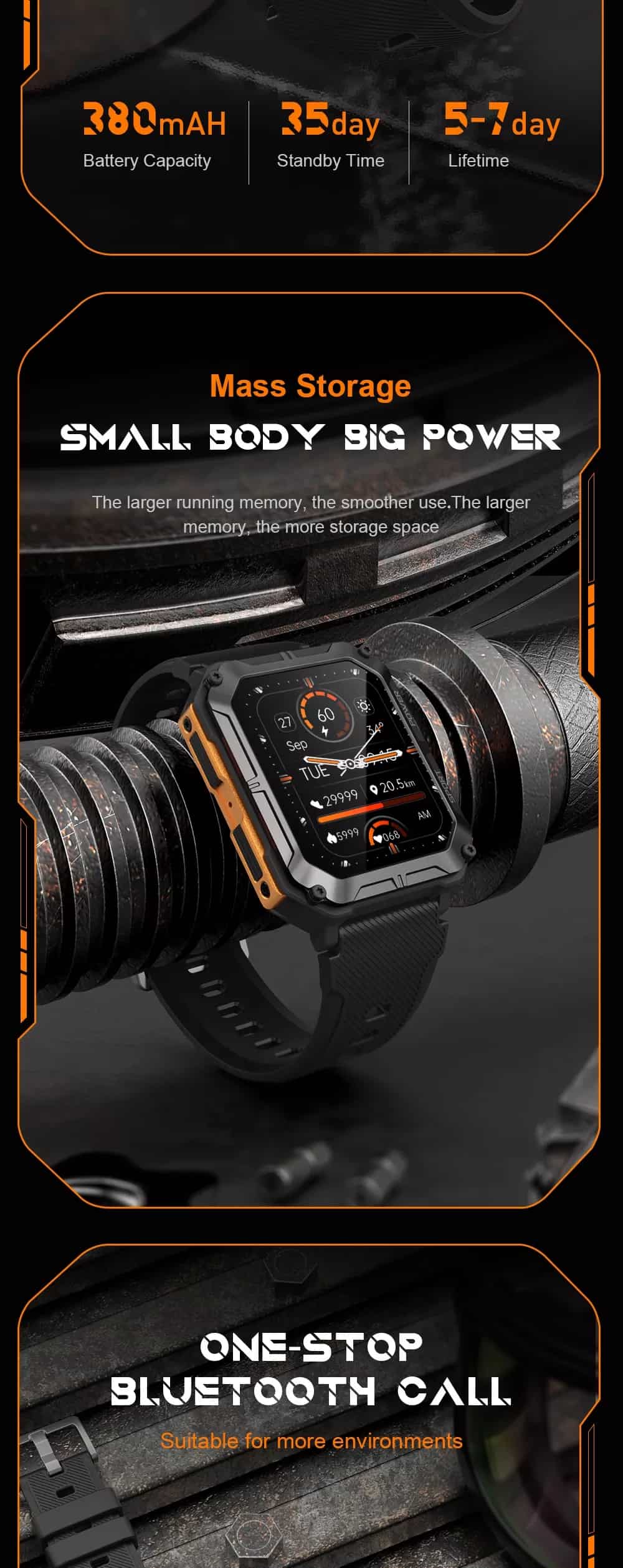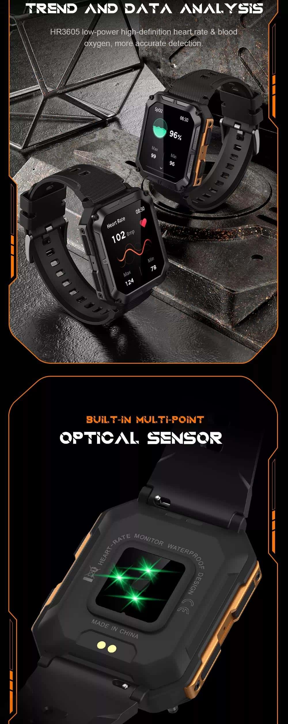 Its another military style, outdoor rugged smartwatch, the Military Style Rugged Smartwatch has that outdoor design, sporty. It has a mechanical look, layered frame with screws, octagonal size, PC material with combination of metal material. It has power buttons, power with dedicated sports button on its side. It is an attractive-looking rugged smartwatch, its not bulky like other rugged smartwatches in the market. The design of the Military Style Rugged Smartwatch is in the range of the popular Kospet Tank M1. The C20 Pro smartwatch has an outdoor look, and its frame is bump roof, that has an anti- smash body, anti-freeze body.