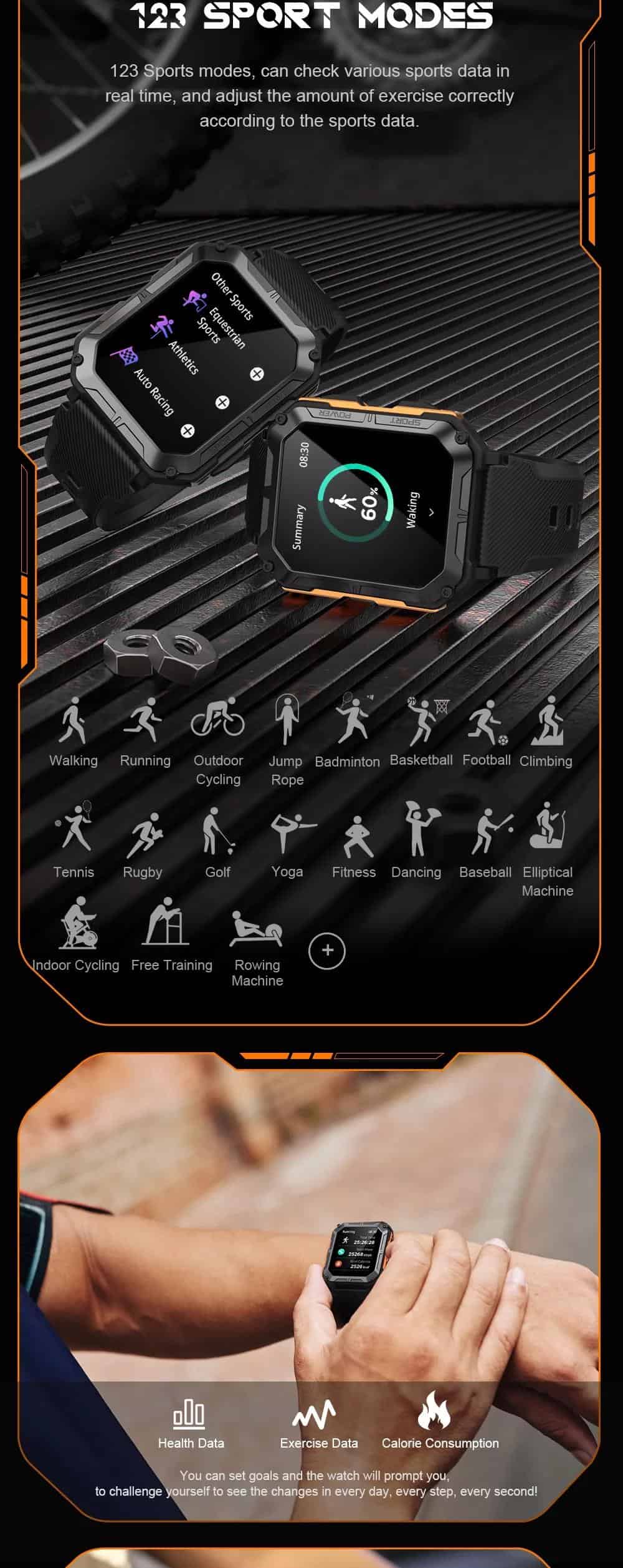 With the rugged, outdoor style of the Military Style Rugged Smartwatch, it is just fitting that the wearable has a comprehensive list of sport functions. The wearable is loaded with at least 123 sports mode, some of the sports loaded are walking, running, outdoor cycling, jump rope, badminton, basketball, football, climbing, tennis, rugby, golf, yoga, fitness, dancing, basketball, elliptical machine, indoor cycling, free training, rowing machine. Each sport functions, may monitor the HR, steps, calories as well as distance traveled, and time.