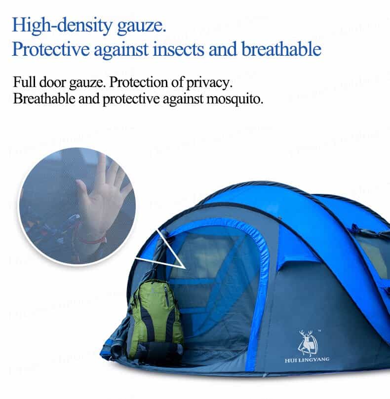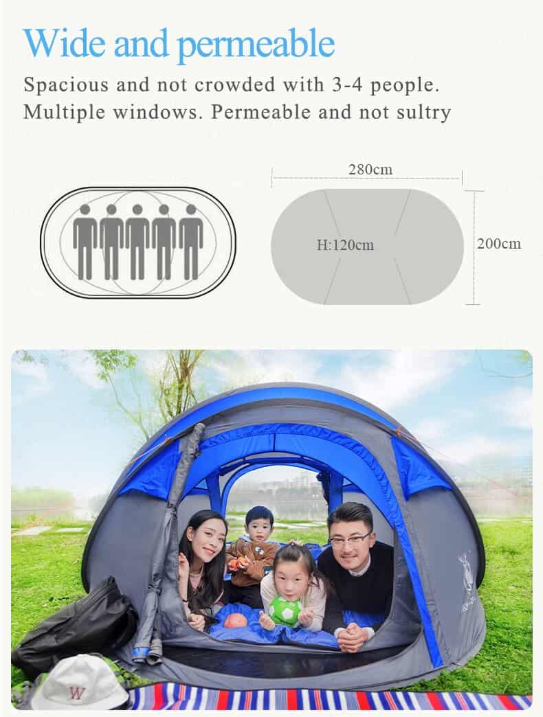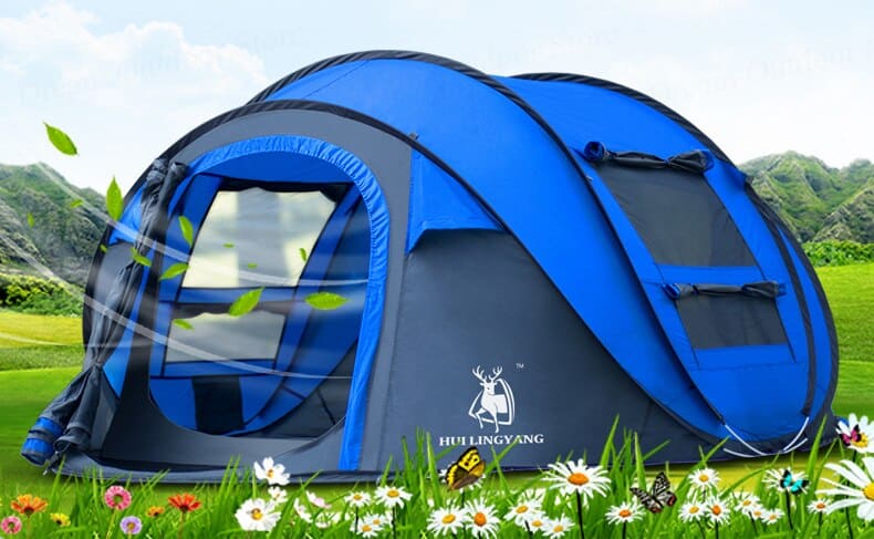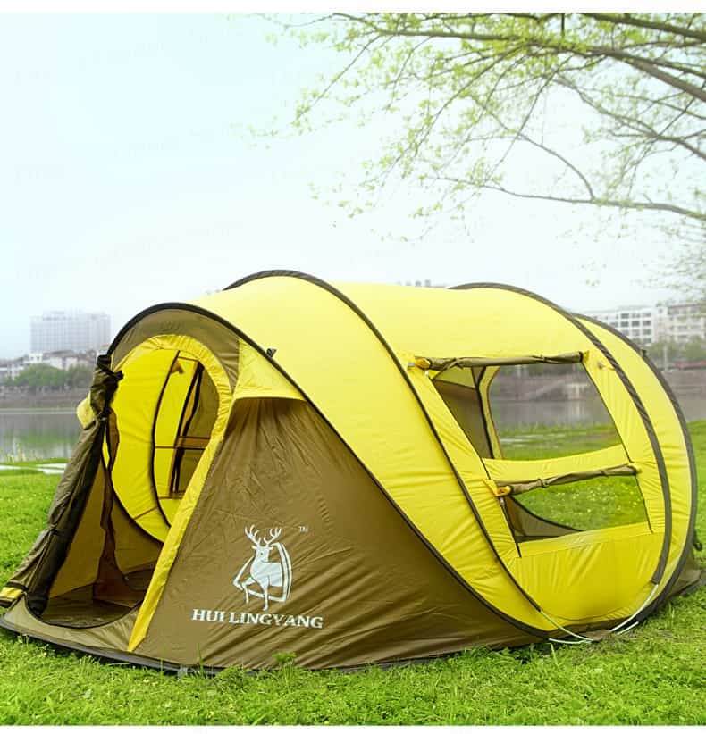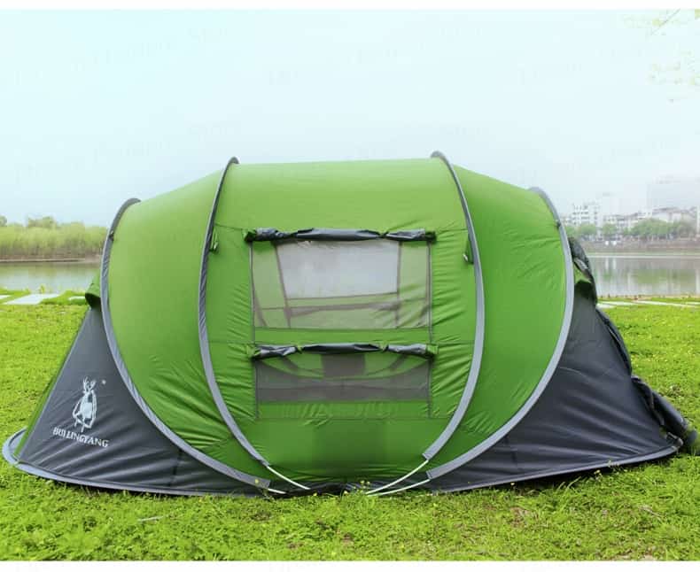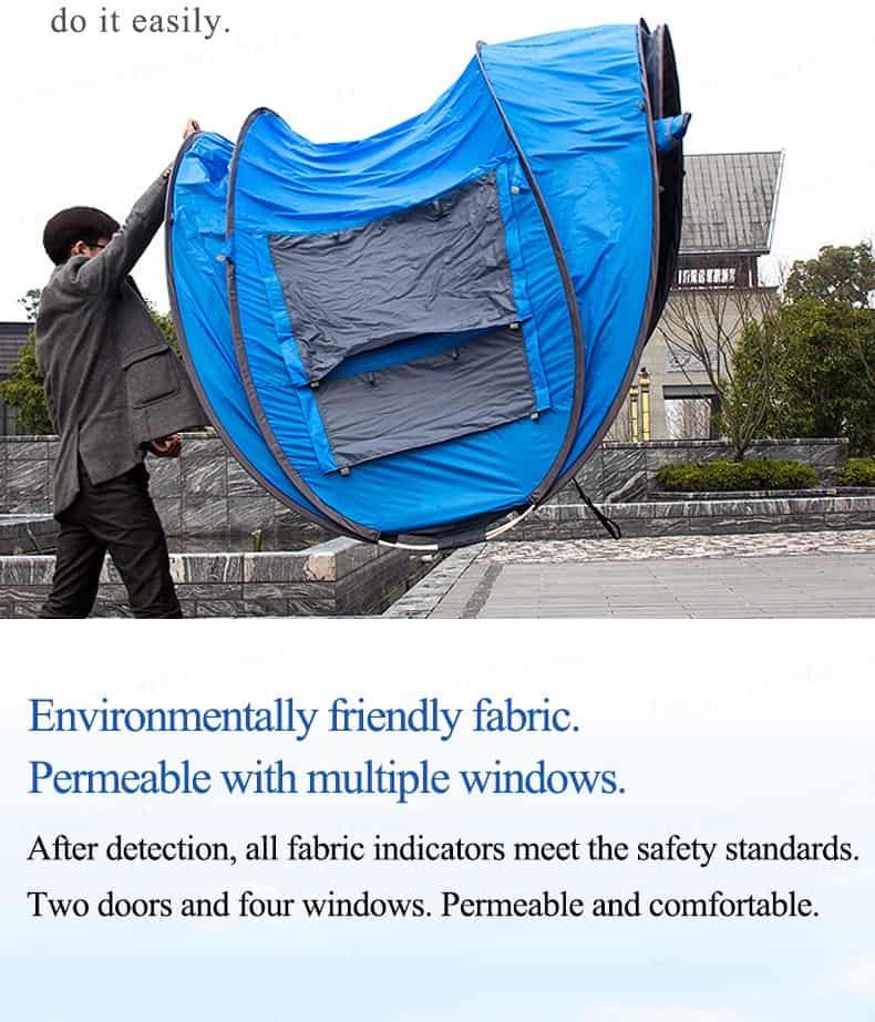 Virtually a portable chateau, this outdoor pop up tent boasts room for 4 people. Toss it lightly in the air and it instantly pops up, ready and set for camping. With waterproof bottom, breathable and wear resistant material, solid fibreglass strut, this tent provides maximum strength against the elements.