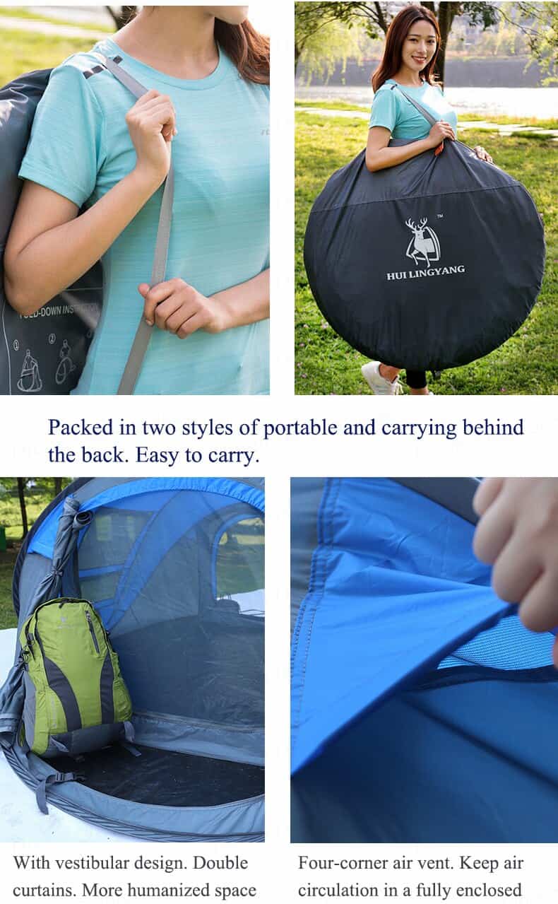 Hello, everybody! The tent is very huge, fit about 5 people. There is a dressing room for shoes. The windows are on four sides, which is very good for our hot region. Nets from insects on all windows and entrances. Tent super. I recommend the store, everything is in perfect condition and came quickly.