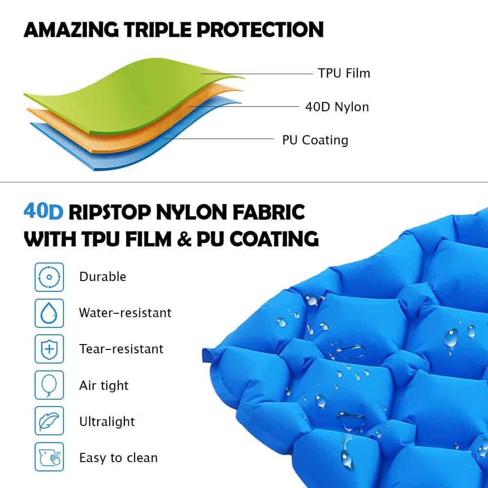 1. Extremely Durable: As hikers & campers ourselves, we were sick and tired of having mats pop on us! This is why we made sure the mattress we created wasn’t going to do so… We use durable dual-layer material for ultimate resistance.