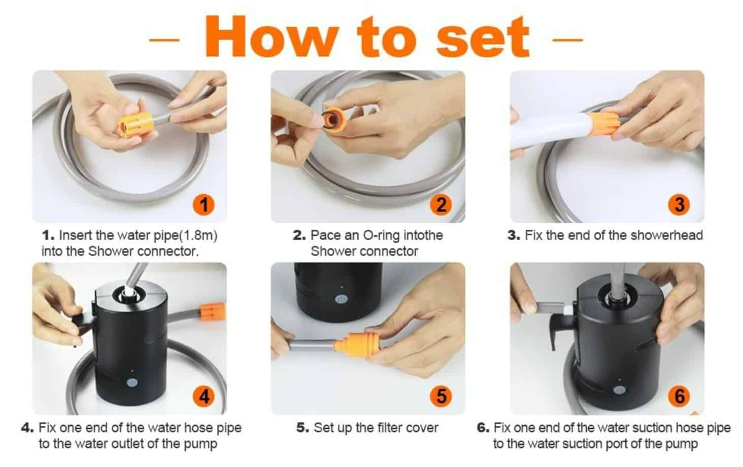 simply install in 3 minutes: connect tubes to pump and shower head, drop the suction pipe into the bucket of water, press the on/off button, ready to get a shower!
