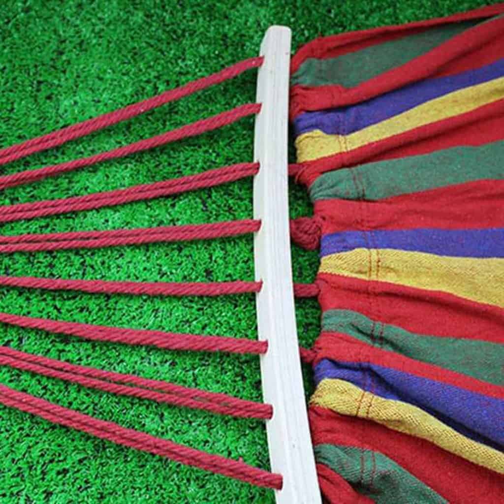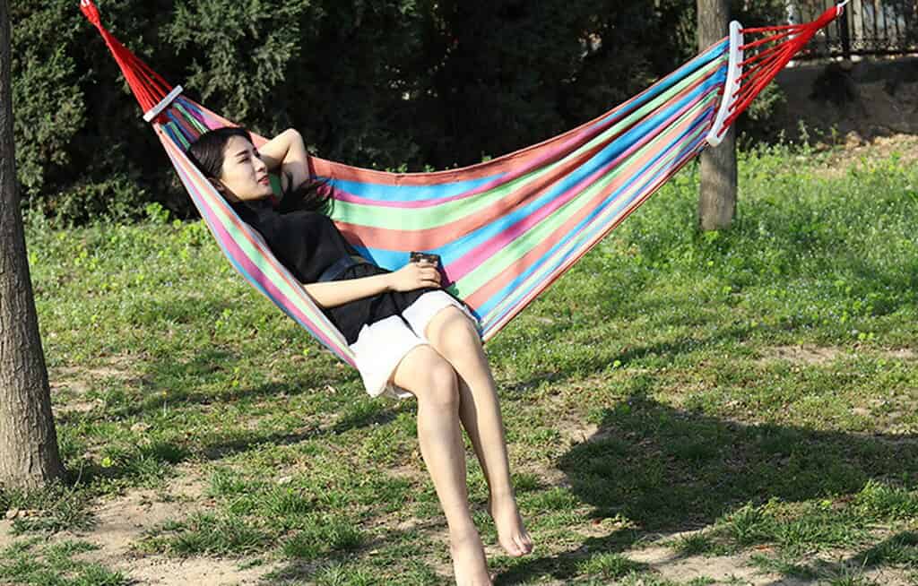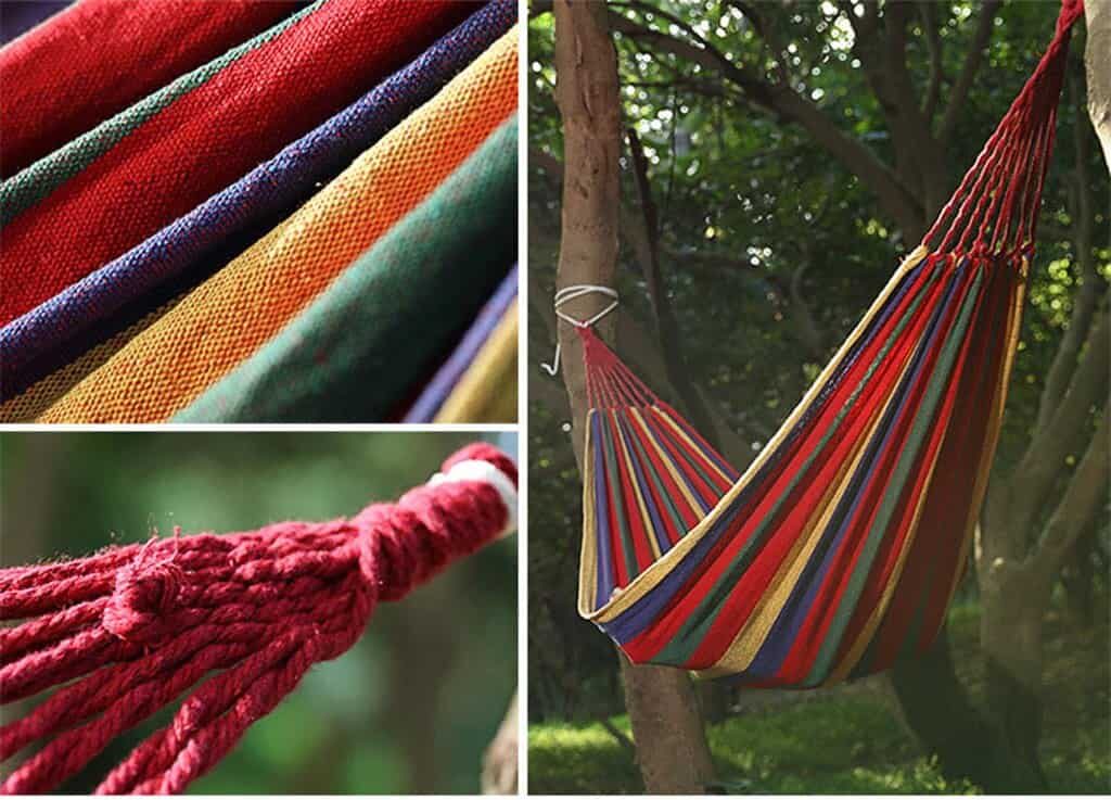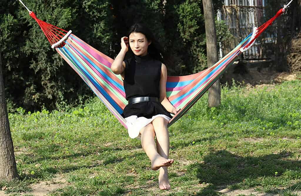 Looking for a flexible hammock? Sure, take a look at this Portable camping hammock. Our hammock comes with a free carry bag for easy transportation. Leave it in in the backyard, bring it to the cottage & hang it on the porch, take it camping, or use it anywhere indoor/outdoor, the choice is yours. You can choose to tie it to a tree or put it on a steel frame; enjoy the air and scenery with friends in the front yard, back yard, or terrace. Our hammock is equipped with everything you need to be laid out in relaxation just moments after receiving it. With durable design get the most out of your purchase with a hammock that will hold up years down the road. Our hammock has a durable construction, designed with cotton to ensure a quality and comfortable hammock for an extended period. Get yours!