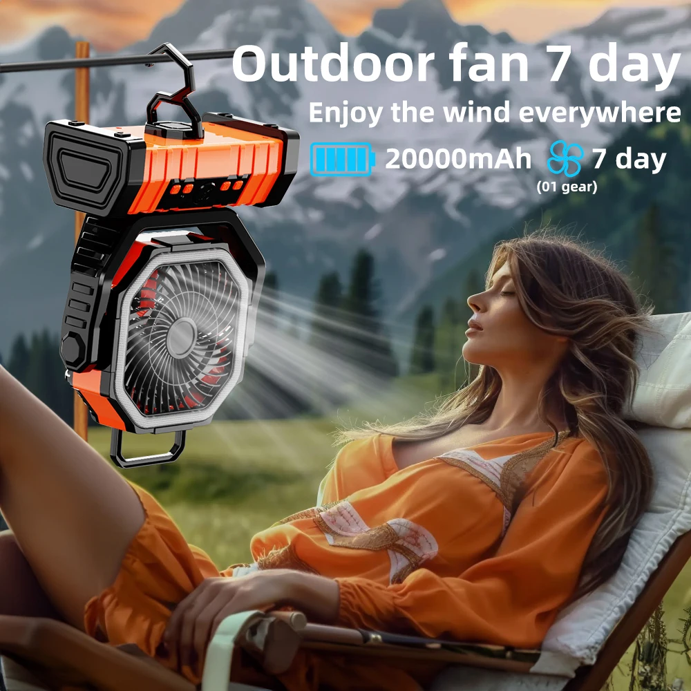 – The 3-in-1 rechargeable battery-powered fan has a 20000 mAh large-capacity battery with a high conversion rate. The portable camping fan could be charged via Type-C with 5V/3A charging until the power indicator reaches 100%, and it can be used continuously for 10-138 hours. This battery-operated fan can also be reverse-charged via the built-in USB output port as a power bank, perfect for avoiding power outages while camping, BBQing, or traveling.