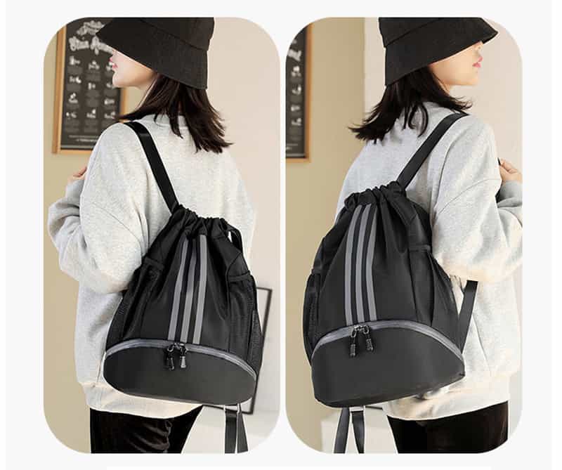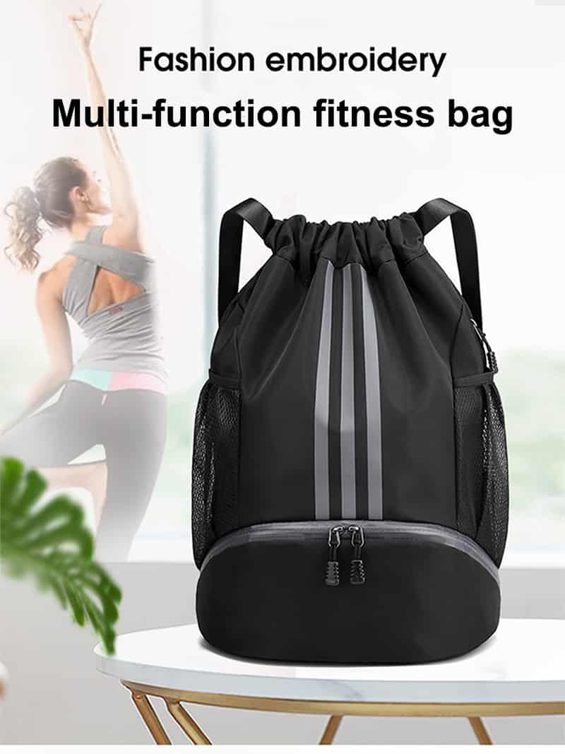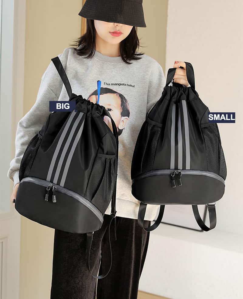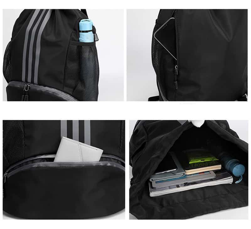 Multi-Pocket Design: Side mesh pockets with elastic straps on both sides of the sports bag backpack can accommodate water bottles and umbrellas; front pocket can store tissues and toiletries; the bottom is an independent shoe compartment; There is also an extra interior zippered pocket inside the rope bag, which is big enough to hold small valuables like sports watch, wallets, etc. to avoid the pickpockets
