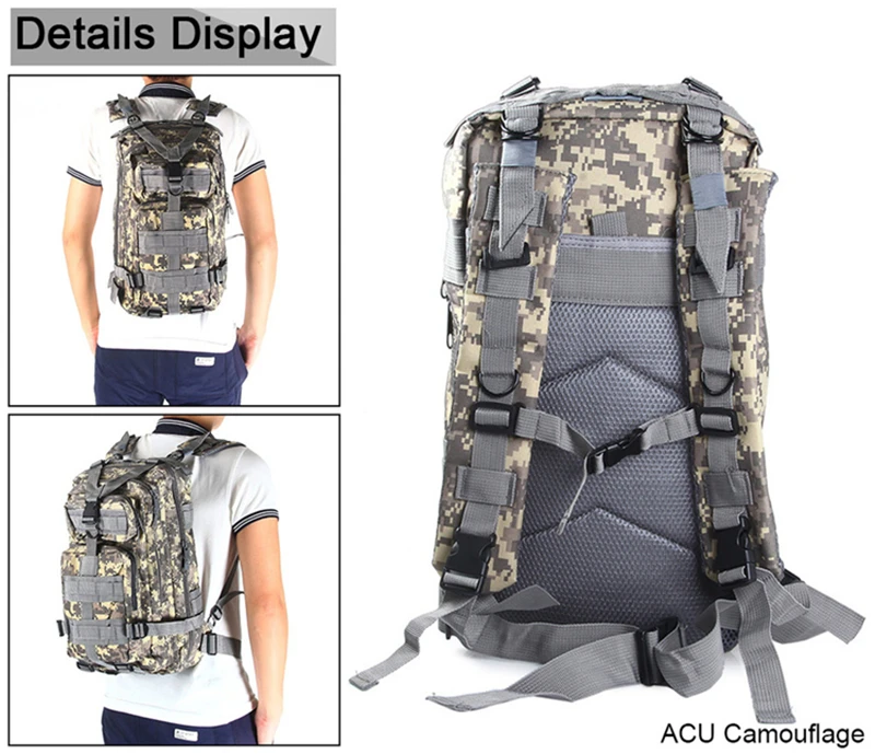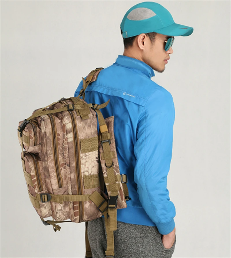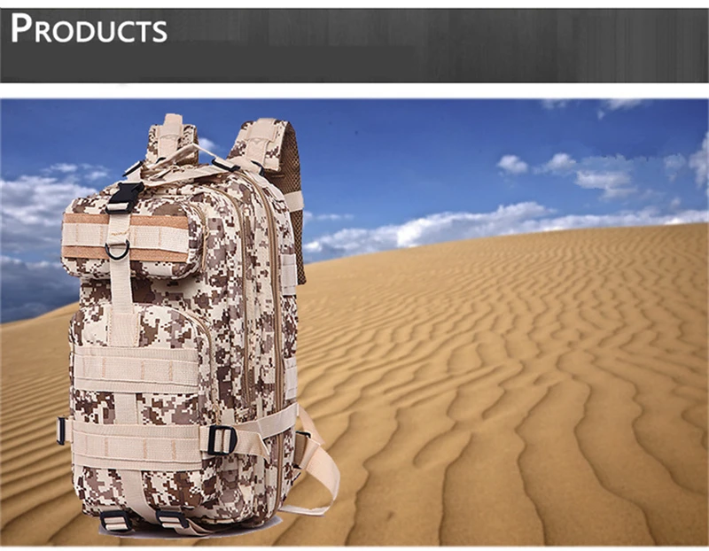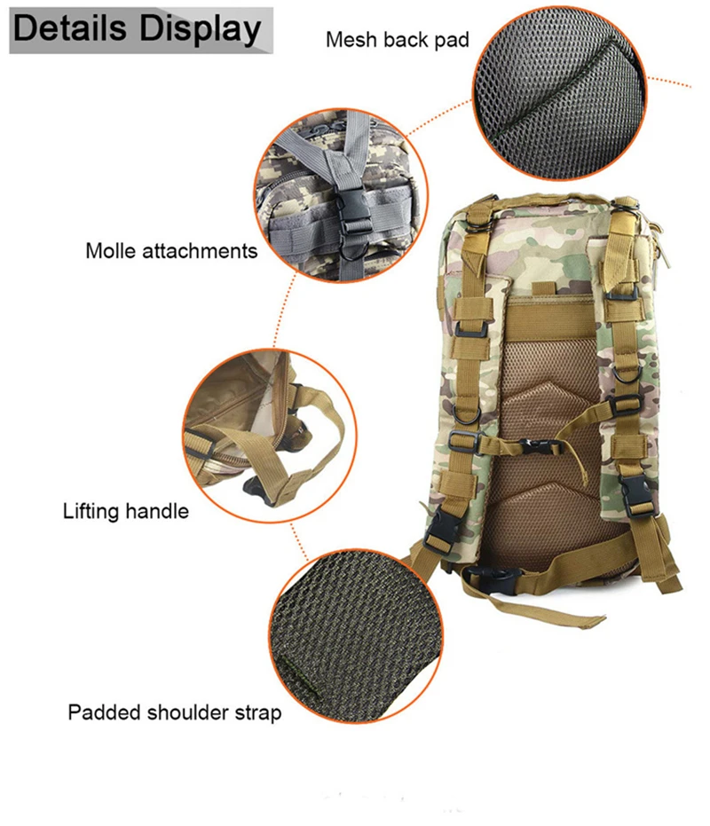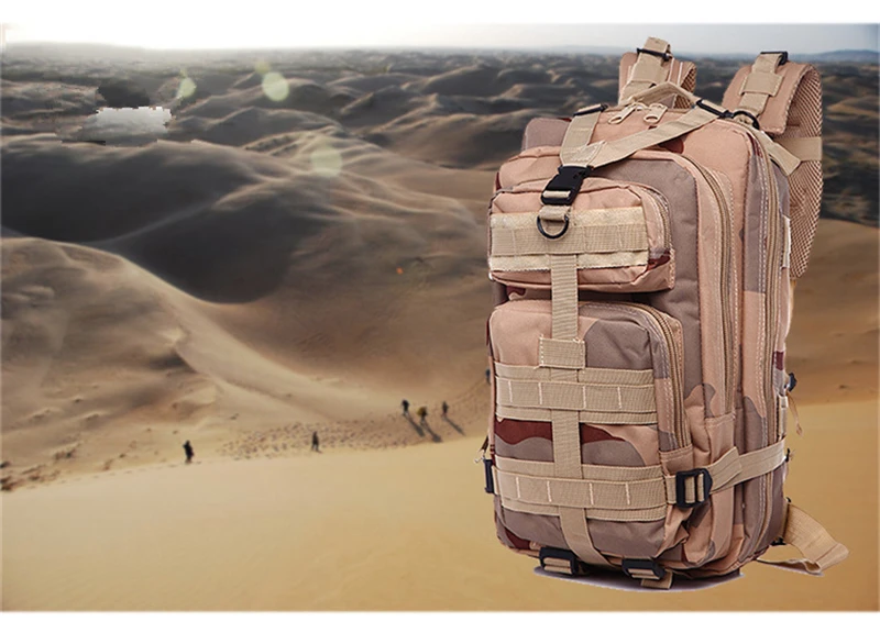 Are you dreaming of an amazing and practical backpack accompanying your travel? If so, this tactical outdoor military backpack is your top choice. It is made from durable material and coolly designed: 2 zippered compartments plus front zip pouch to organize your items, padded shoulder straps, compression straps on each side and carry handle on the top. It is such a wonderful bag that will surely make your experience fantastic.