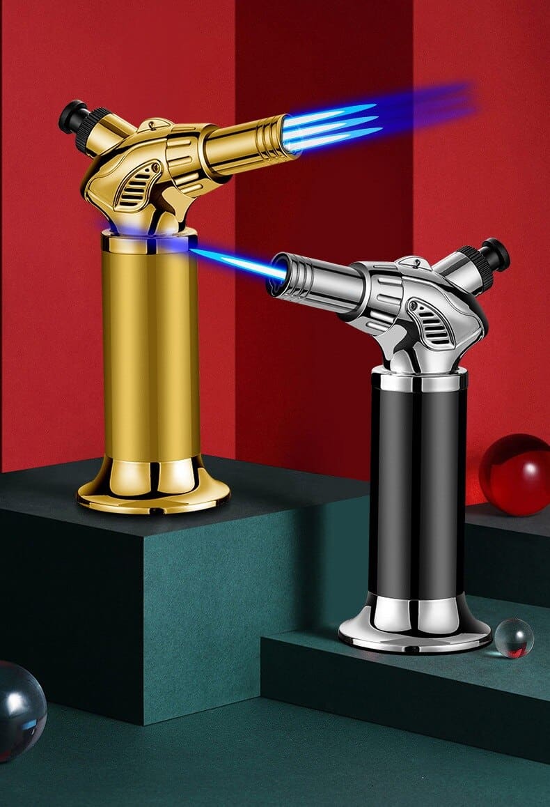 • Torch Lighter: Features a more complex design with a jet nozzle that propels the flame. It uses butane gas as well, but the delivery system creates a more concentrated and powerful flame.